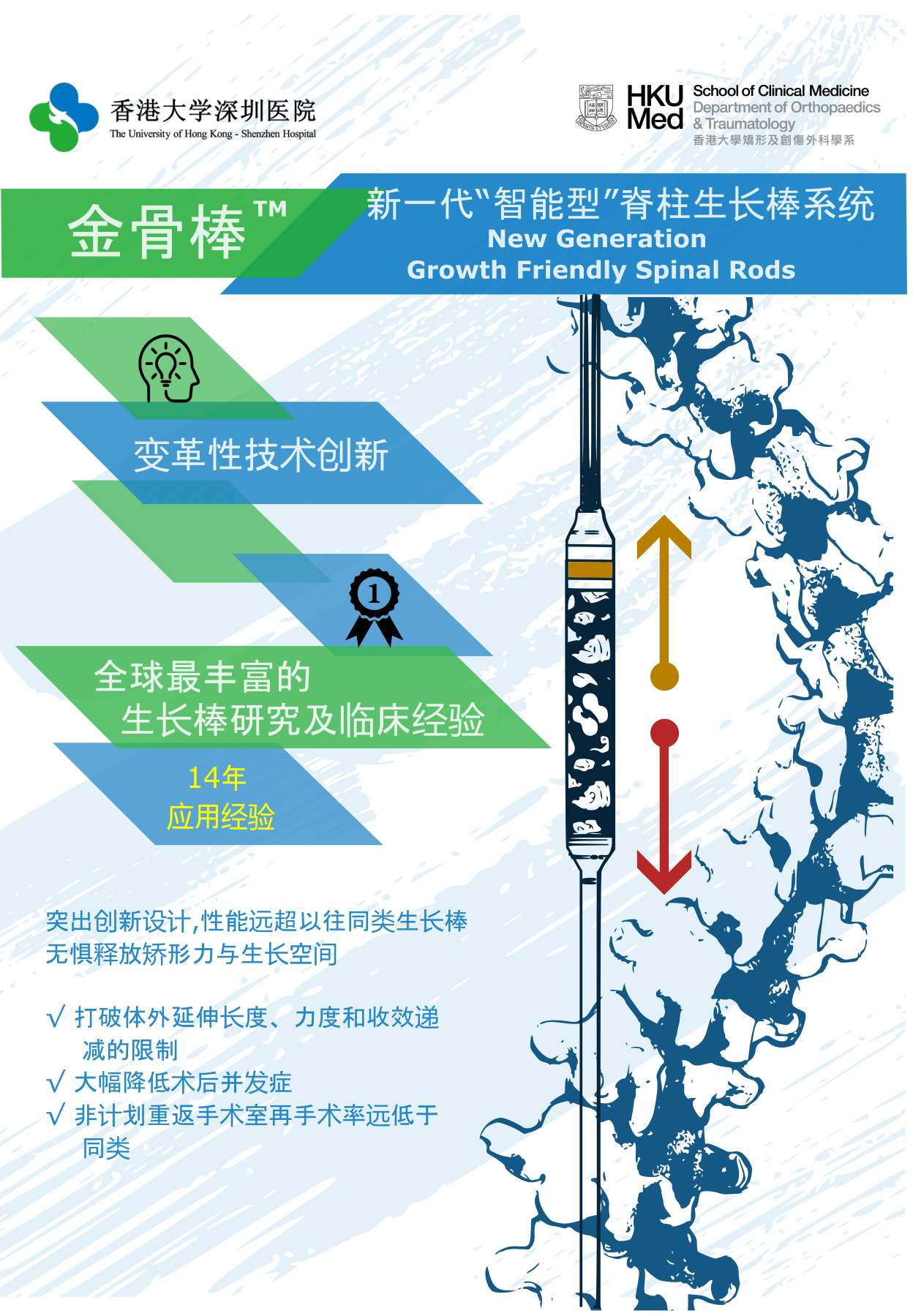 We developed a novel magnet-free and fully biocompatible growing rod technology as a replacement for the magnetic actuators of the growing rods to address the biocompatibility issues, ensuring the rods can be used without any adverse effects, and improved the design to minimize the mechanical complications.
